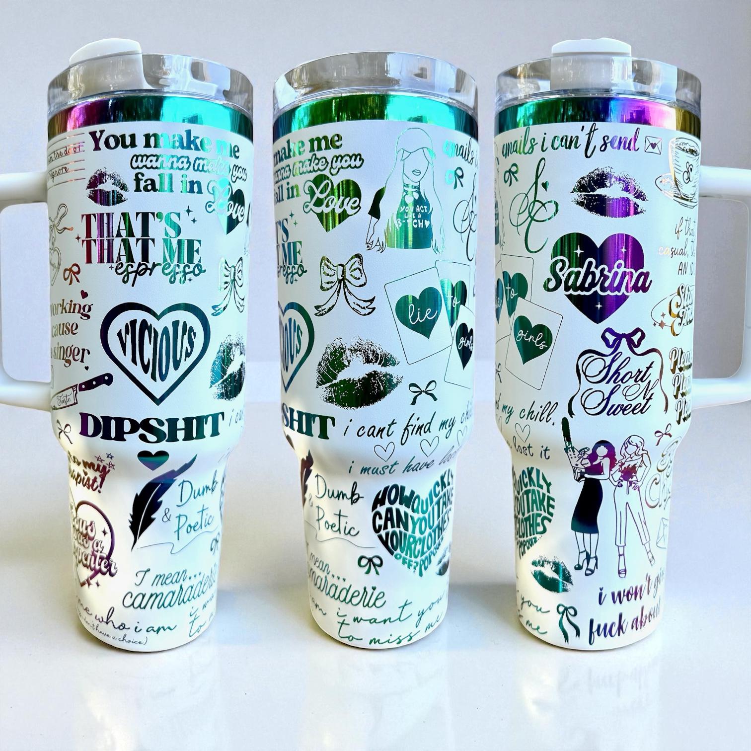 A gorgeous Sabrina Carpenter design featuring songs and icons from her "Short N' Sweet" and "EICS" eras engraved on a white or black color tumbler of your choice.