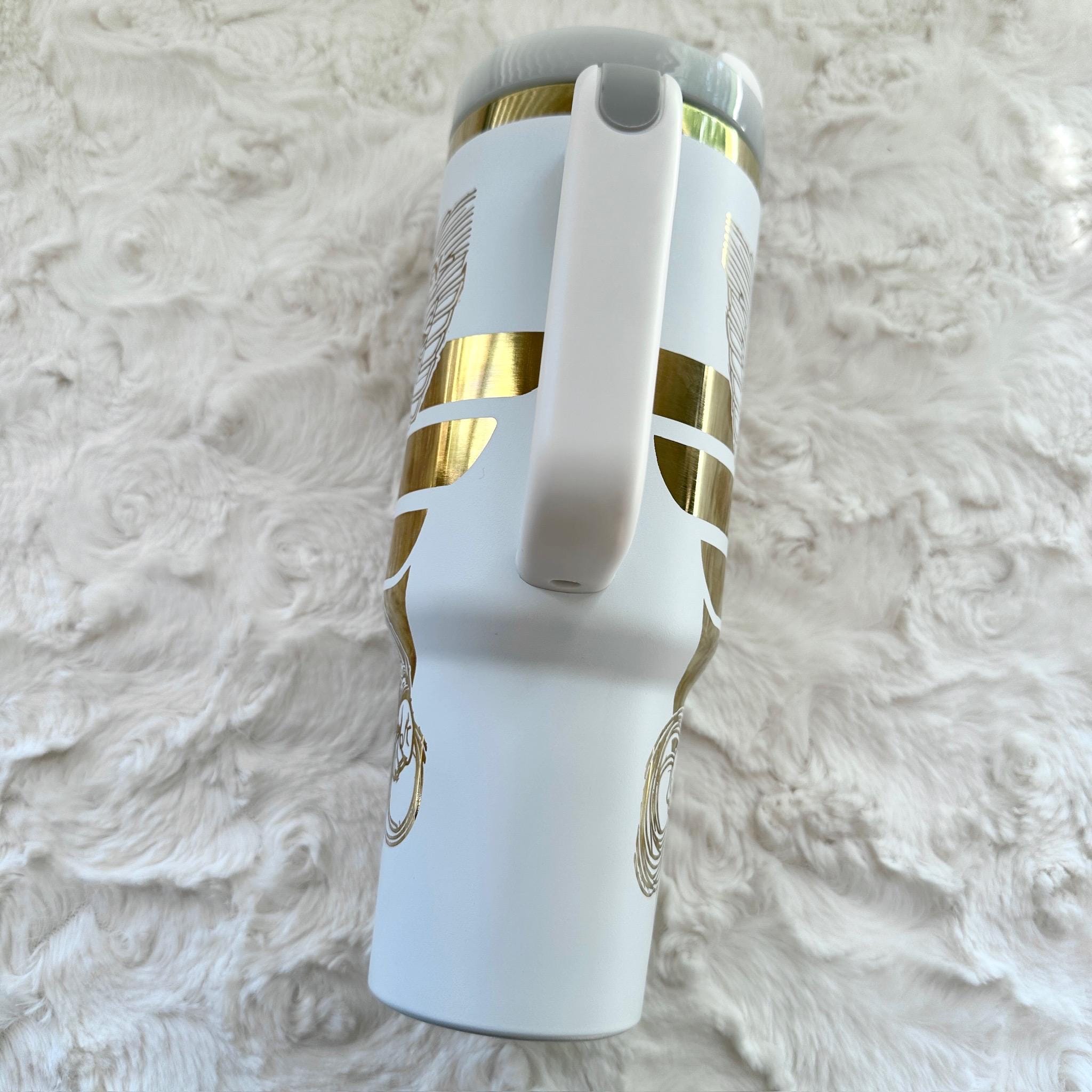 Enjoy a full 40 oz beverage from a stainless steel vacuum sealed tumbler. Tumbler has an easy-carry and a narrow base that will fit most cup holders. Durable 40 oz tumbler, made with recycled stainless steel, is up to the hydration challenge. The double-wall vacuum insulation will keep your beverage warm for 9 hours and iced for 40 hours. There are no logos or brands printed on the tumblers. Dishwasher Safe. The shape/size of these tumblers are equivalent to a Stanley 40 oz Quencher.