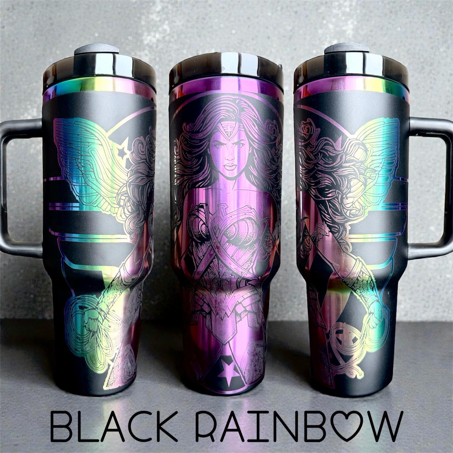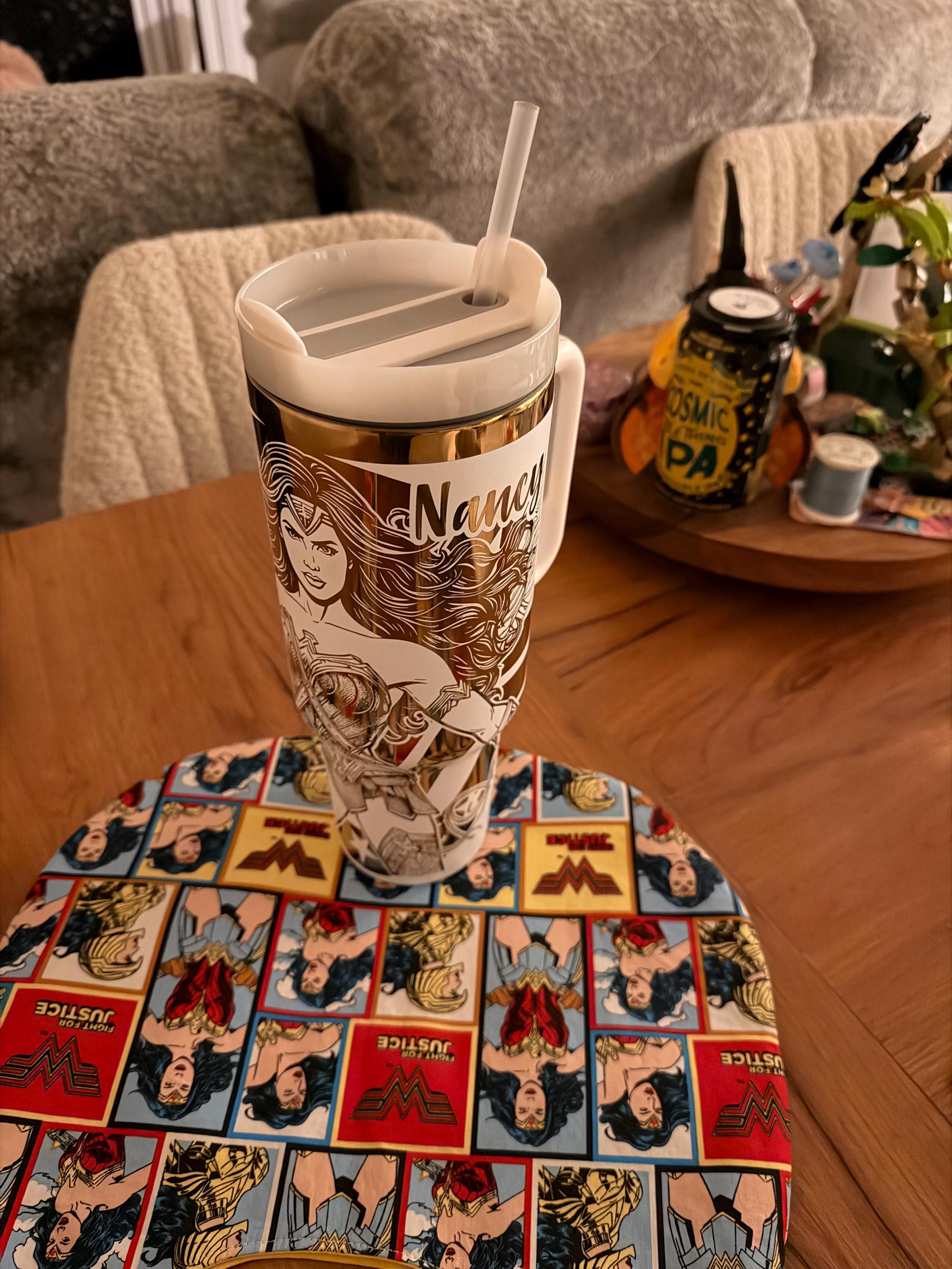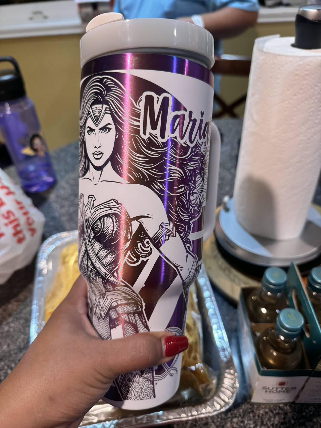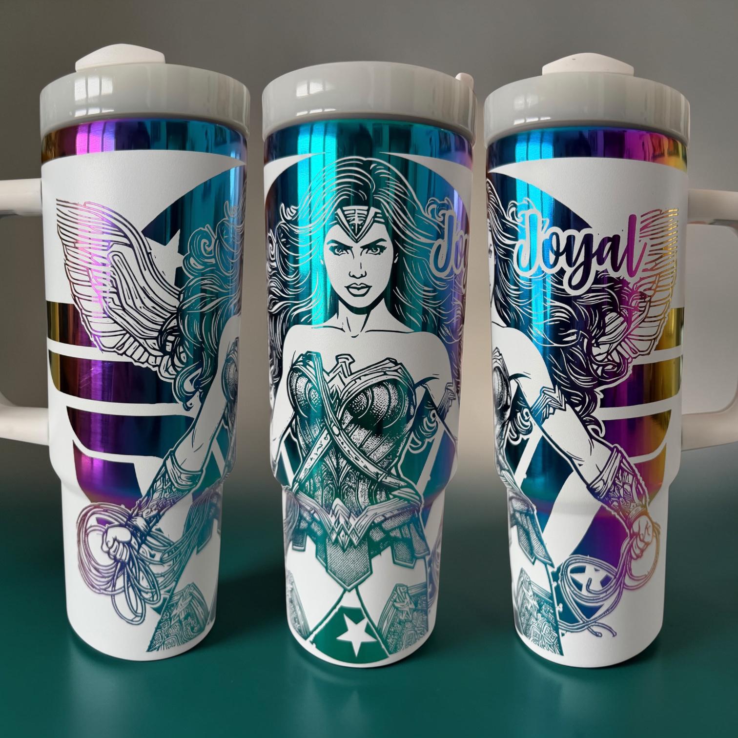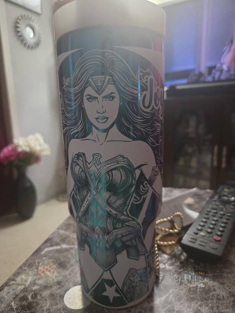 A beautiful laser engraved cup showcasing your favorite female superhero.