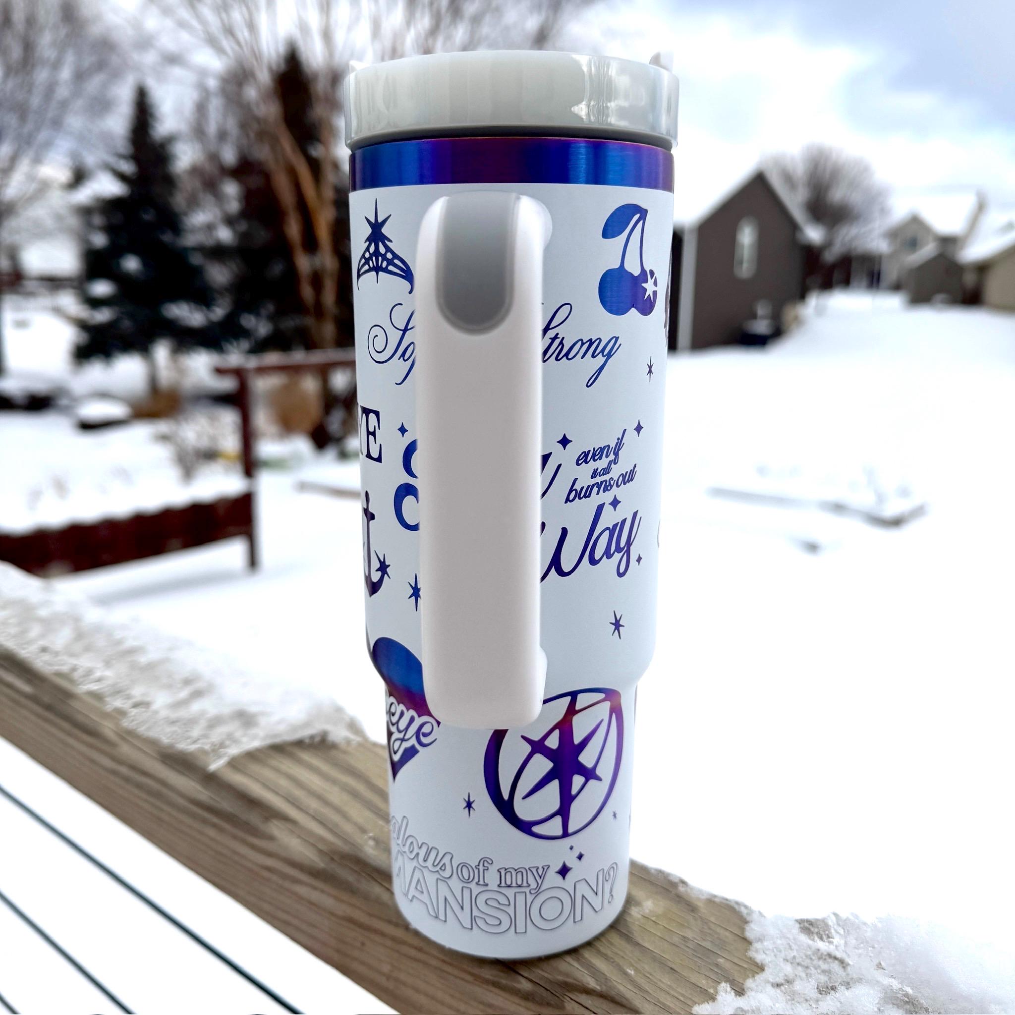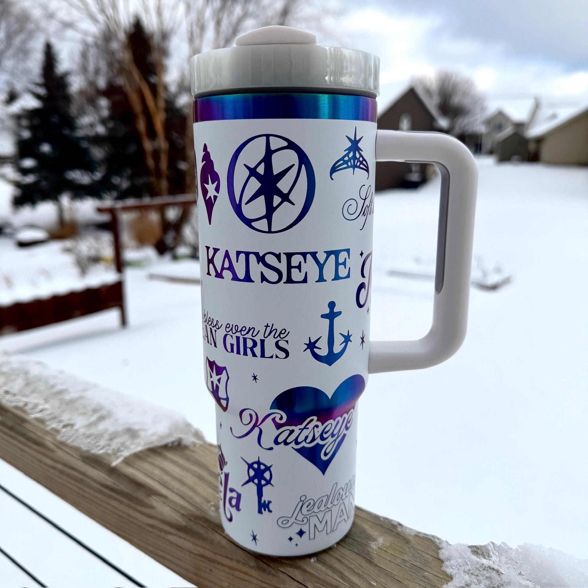 A fun and funky Katseye design featuring some of their most popular songs and icons engraved on a tumbler of your choice.